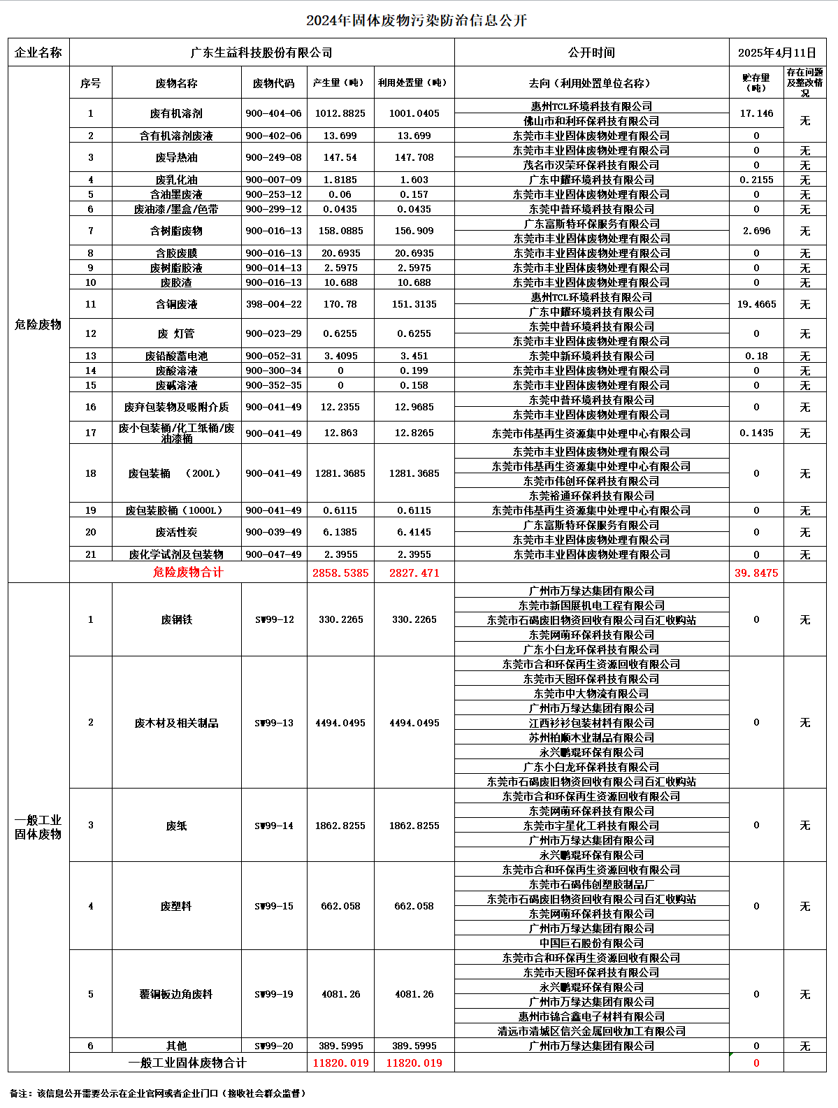广东必一运动股份有限公司2024年危险废物污染防治责任信息公开