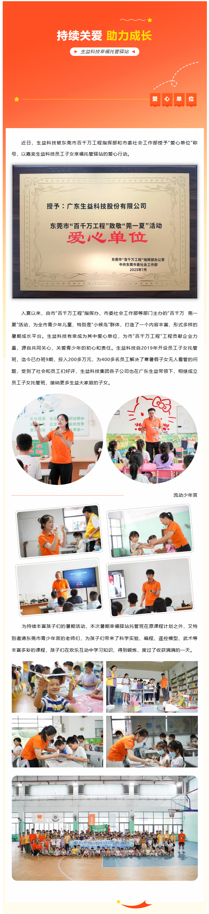 持续关爱 助力成长——广东必一运动官网荣获“爱心单位”称号