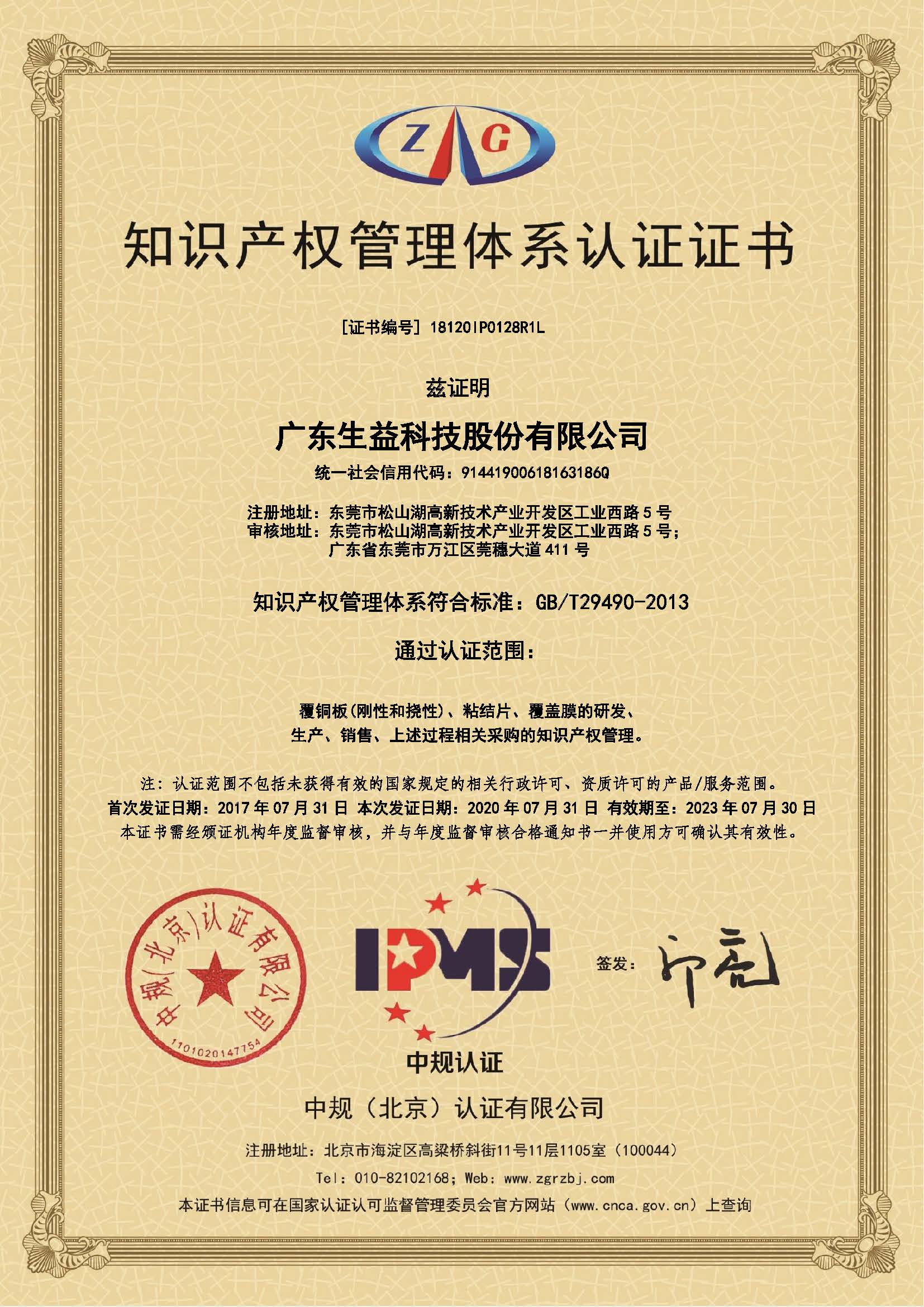 知识产权管理体系证书(广东必一运动官网)