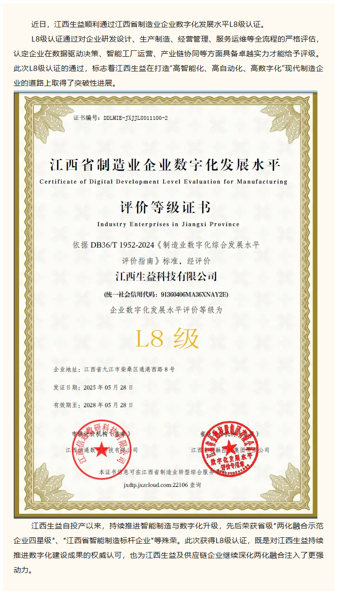 江西必一运动官网顺利通过江西省制造业企业数字化发展水平L8级认证